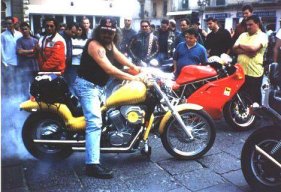 Da Circa 3 anni ho scelto principalmente i raduni free e gli M.C. non molto "imponenti" però ogni tanto faccio una puntatina anche a dei veri Mostri, l'anno ( 1999 ) scorso sono stato alla Biker Fest a Osoppo, e dopo aver fatto 1360 km (2720A.R.) devo dire che ho trovato un Casino assurdo, con migliaia di persone che, onestamente non mi ha entusiasmato molto anche se anche in quel caso ho trovato molti Amici. Comunque, altri miei interessi sono l'informatica, la musica e la birra, anche se ultimamente non ne mando giù moltissima. Questo sono, con i miei casini e le mie manie, scrivetemi e siate clementi. Come ""mezzo"" per muovermi, fino al 2007 ho usato quelli che vedete nelle foto..... Dal 2007 sono felicemente passato alle Harley Davidson!!!